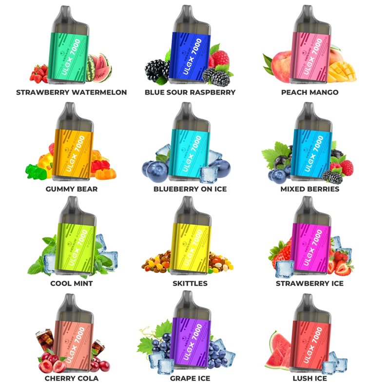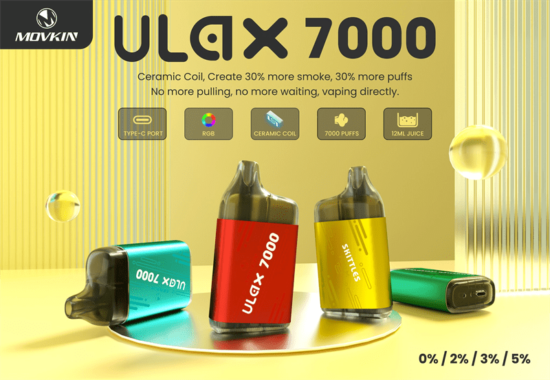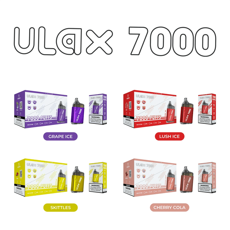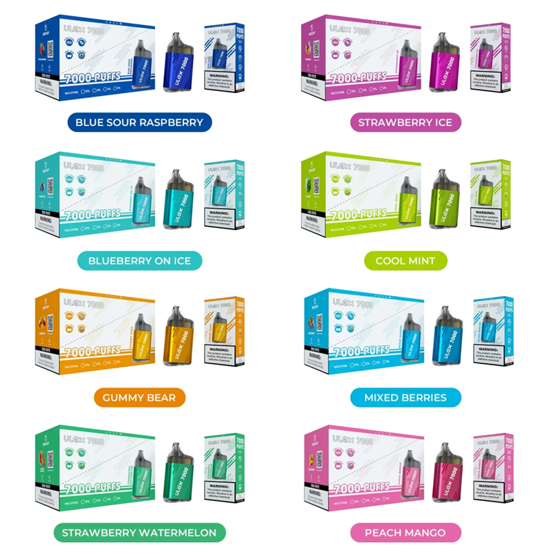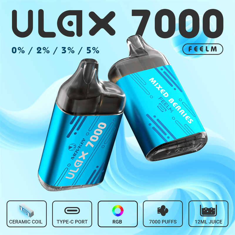 ULAX 7000 is a disposable vape equipped with the ceramic coil (Feelm Technology) which brings a smooth and long-lasting flavor taste. The coil-isolation structure keeps the e-juice fresh and easy to view the e-juice level while using it. Unlike other coil-isolation devices that need wait 1-2 minutes before use, this ULAX 7000 can be used right away after opening the box. It contains 12ml 0/2/3/5% nicotine salt e-juice and vapes up to 7000 puffs. There are 12 flavors for you to choose. The rechargeable port at the bottom of the device guarantees you finish the last drop of the e-juice in the tank all the time.