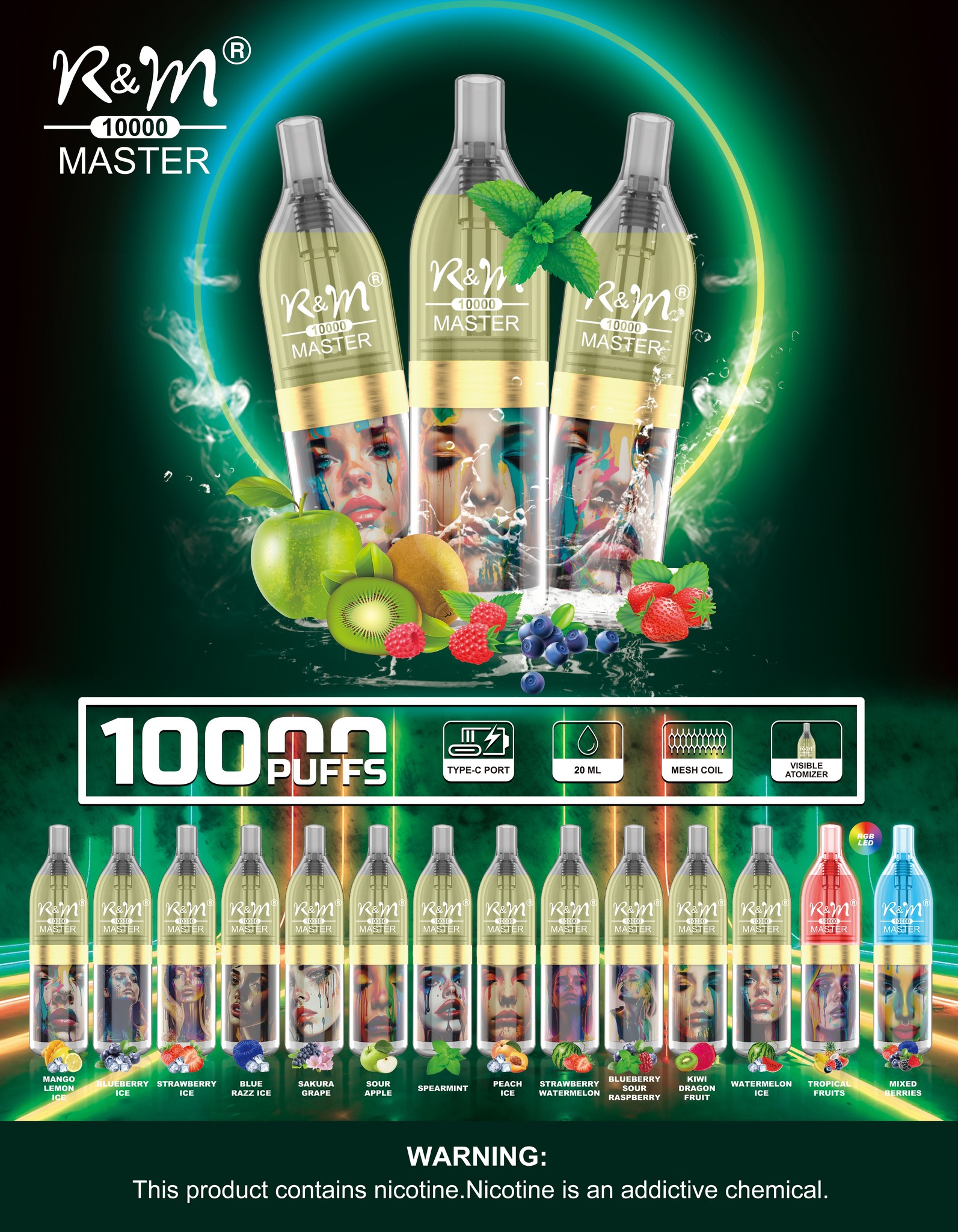 R&M master 10000 is a disposable vape device with crystal body and it is rechargeable. It contains 20ml 0/2/3/5% nicotine salt e-juice and vape up to 10000 puffs. There are 14 flavors for you to choose. The airflow control lets you choose the best spot to suit yourself plus it comes with a rechargeable Type-C port at the bottom of the device, which guarantees you finish the last drop of the juice in the tank all the time.